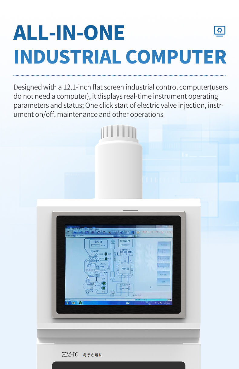 The new generation ion chromatograph adopts a 12.1-inch flat industrial computer integrated design (users do not need to equip a computer), which displays the instrument's operating parameters and status in real time; One click start of electric valve injection, one click completion of instrument on/off, maintenance and other operations, one click access to instrument operation tutorials, convenient and fast.