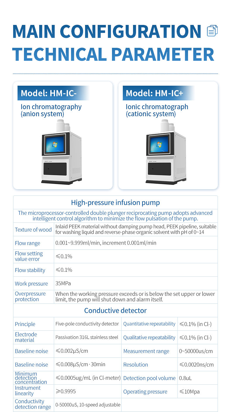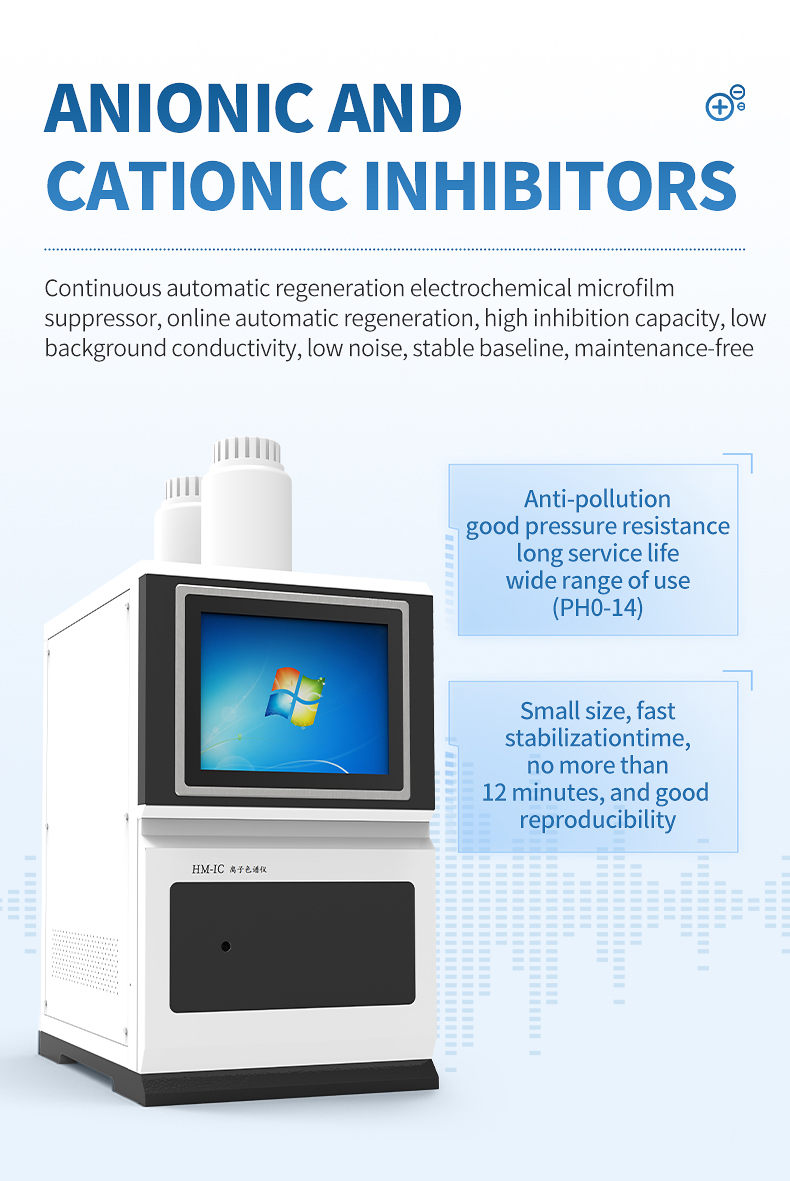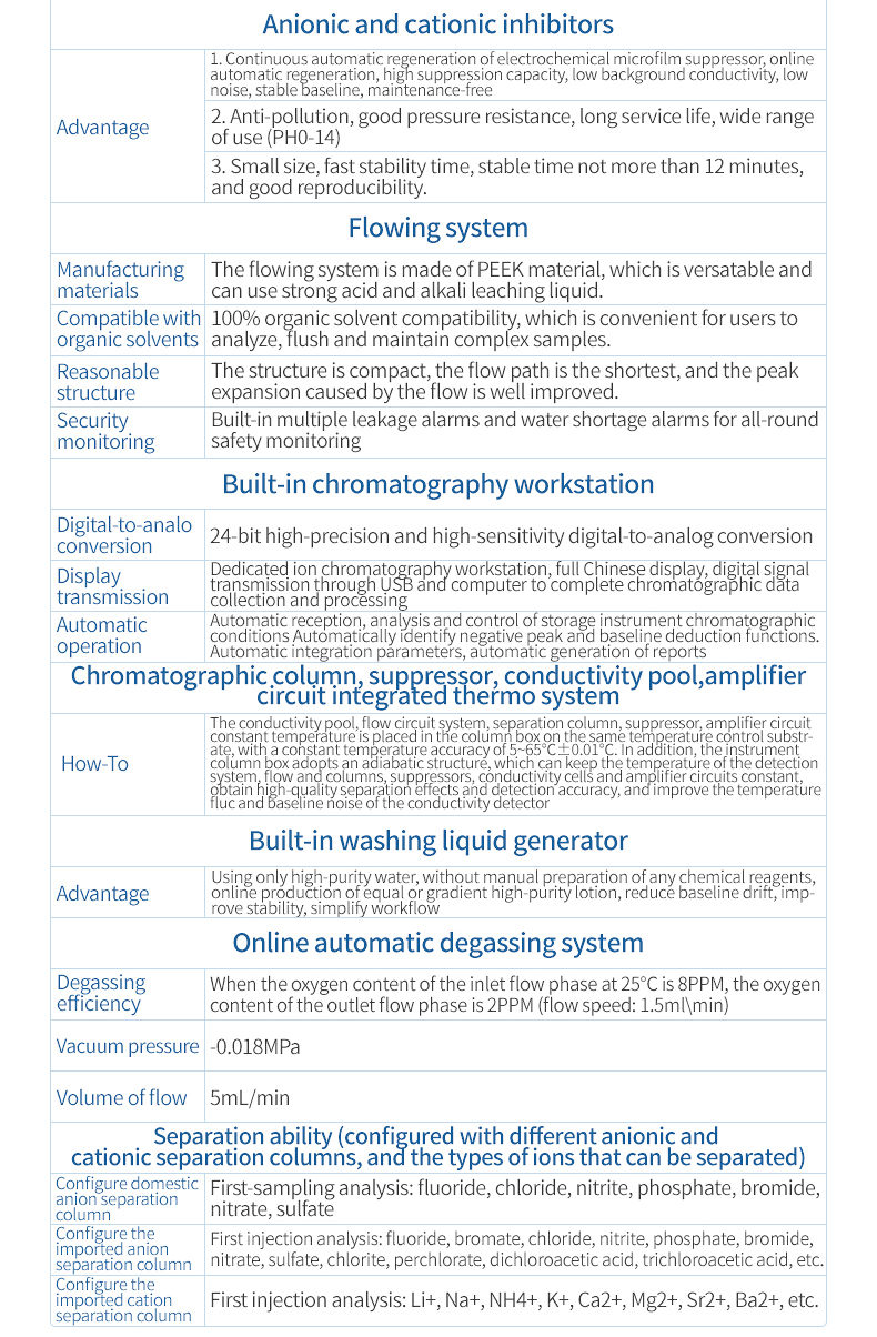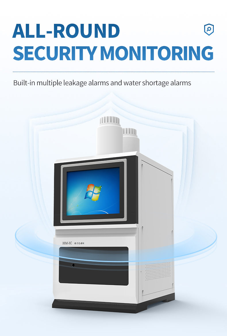The core components of ion chromatography are independently developed and have controllable intellectual property rights. Adopting an integrated design, it integrates the ion chromatography host, eluent generator, industrial computer, and chromatography workstation into one, with a compact structure and the shortest flow path, which greatly improves the peak expansion caused by the flow path. Integrated constant temperature box: The chromatographic column, suppressor, conductivity cell, and amplification circuit are all in the same constant temperature system, which improves the temperature drift and baseline noise of the conductivity detector. Built in multiple leak and water shortage alarms for comprehensive safety monitoring. The various components controlled by PLC are unified into a centralized software control system on the computer display screen, which is easy to operate and controlled by the mouse.