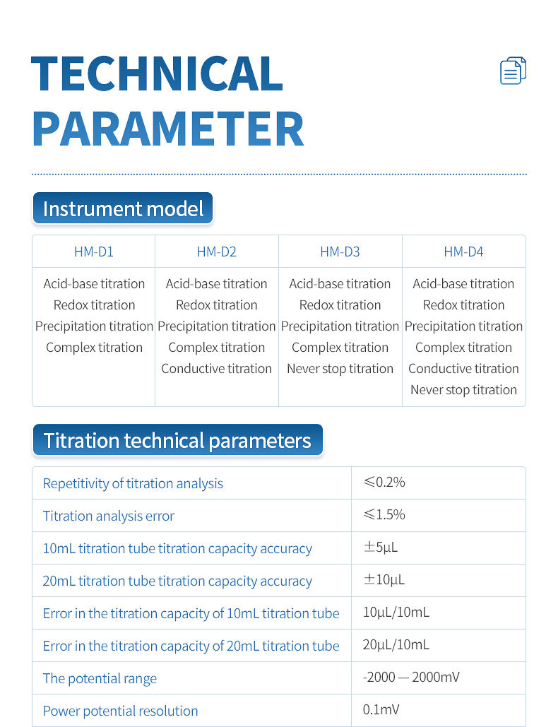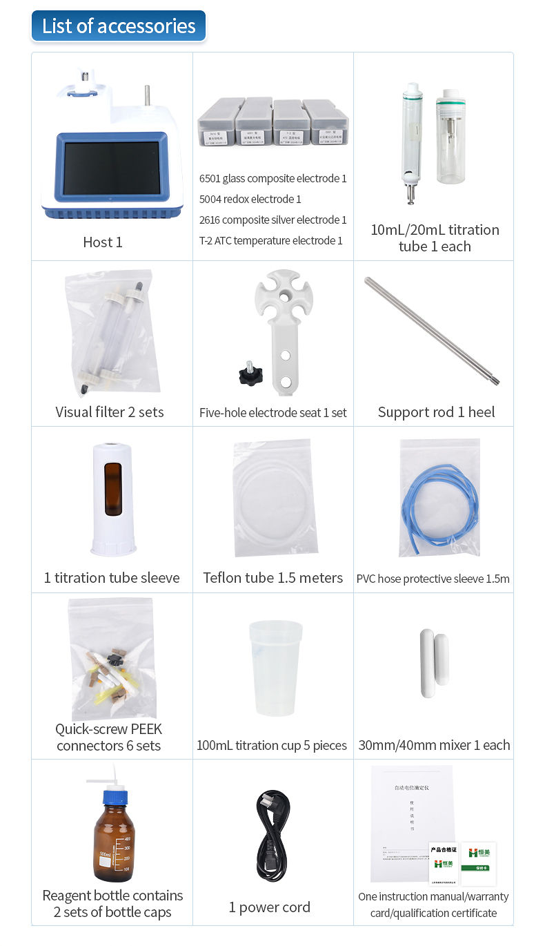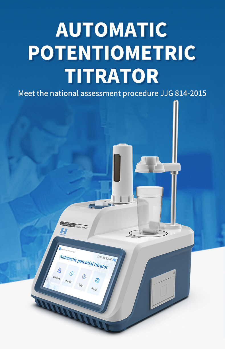 Potentiometric titrator is a precision instrument used for chemical analysis, which determines the concentration of specific components in a sample by automatically adding titrants. This instrument works based on the principle of potentiometric titration, which is a titration device that determines the endpoint of titration based on the change in the electromotive force of the battery during the titration process. The equipment meets the instrument level of 0.05 in the national verification regulation JJG 814-2015 "Automatic Potentiometric Titimeter", which means that the maximum indication error of the instrument is ± 1.5%, and the repeatability of the instrument indication is ≤ 0.2%