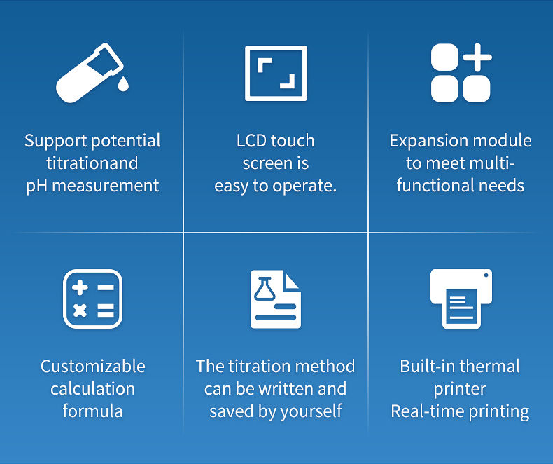 1. The equipment supports potentiometric titration and pH measurement; Users can choose different electrodes to perform various titrations and pH measurements such as acid-base titration, redox titration, precipitation titration, complexometric titration, etc;