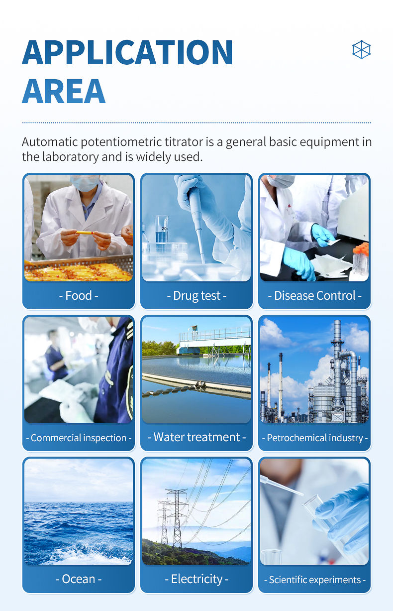 Potentiometric titrator is a universal basic equipment in laboratories, widely used in fields such as food, drug testing, disease control, commodity inspection, water treatment, petroleum, chemical, marine, power, environmental protection, new energy, teaching, and scientific research.