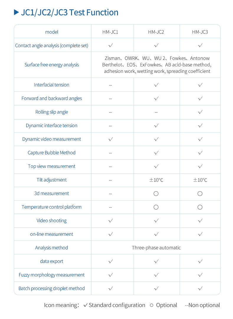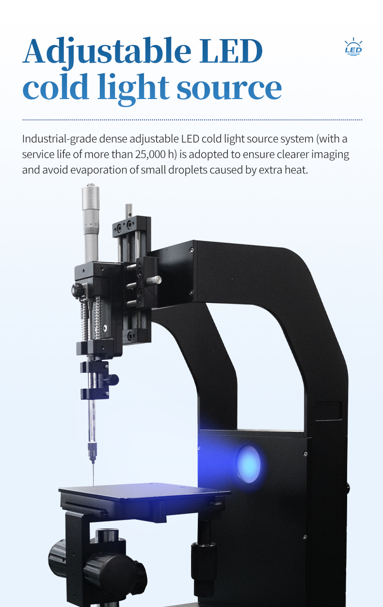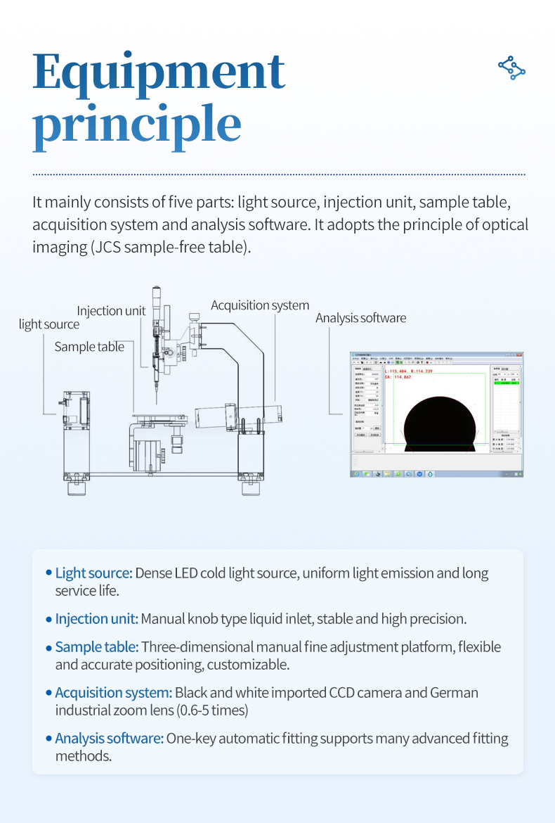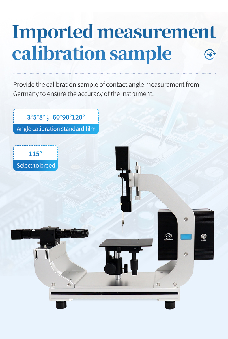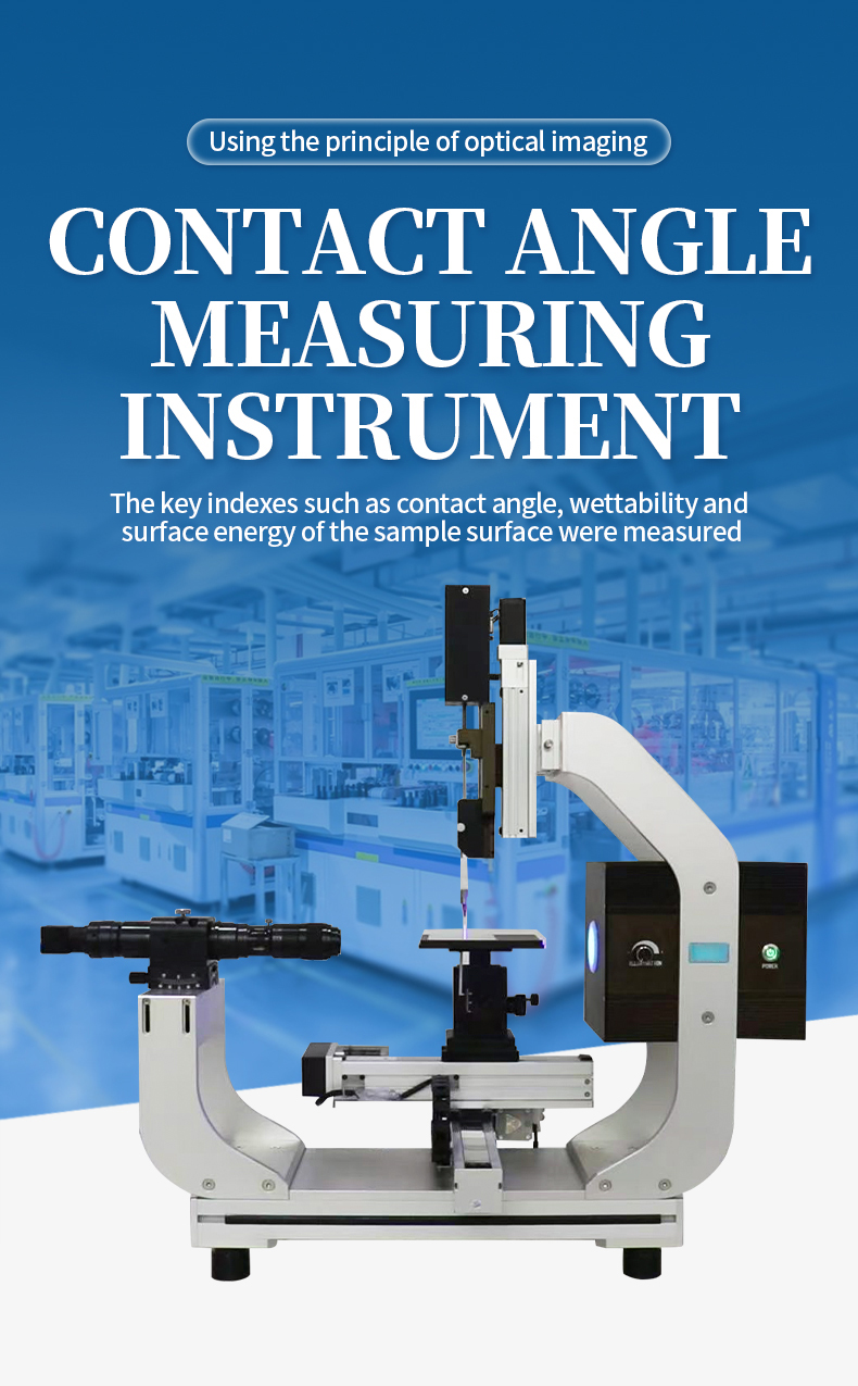 Optical contact angle measuring instrument is an instrument used to measure the contact angle between liquid and solid materials. It is mainly used to characterize the wetting performance of liquid on the surface of solid materials. The image of liquid droplets is obtained through optical imaging, and the contour of the droplet image is fitted by mathematical models using computer software to obtain the contact angle or surface tension. Surface energy calculation and wetting analysis are also performed.