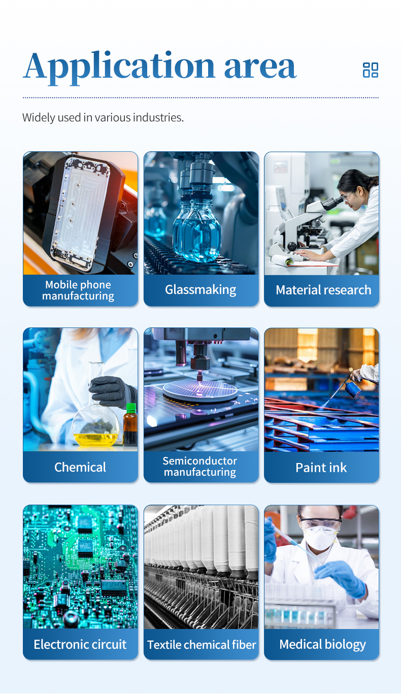 It can be widely applied in materials research, industrial coatings, mobile phone manufacturing, biomedicine, electronic circuits, textile fibers, petroleum extraction, aerospace and other fields.
