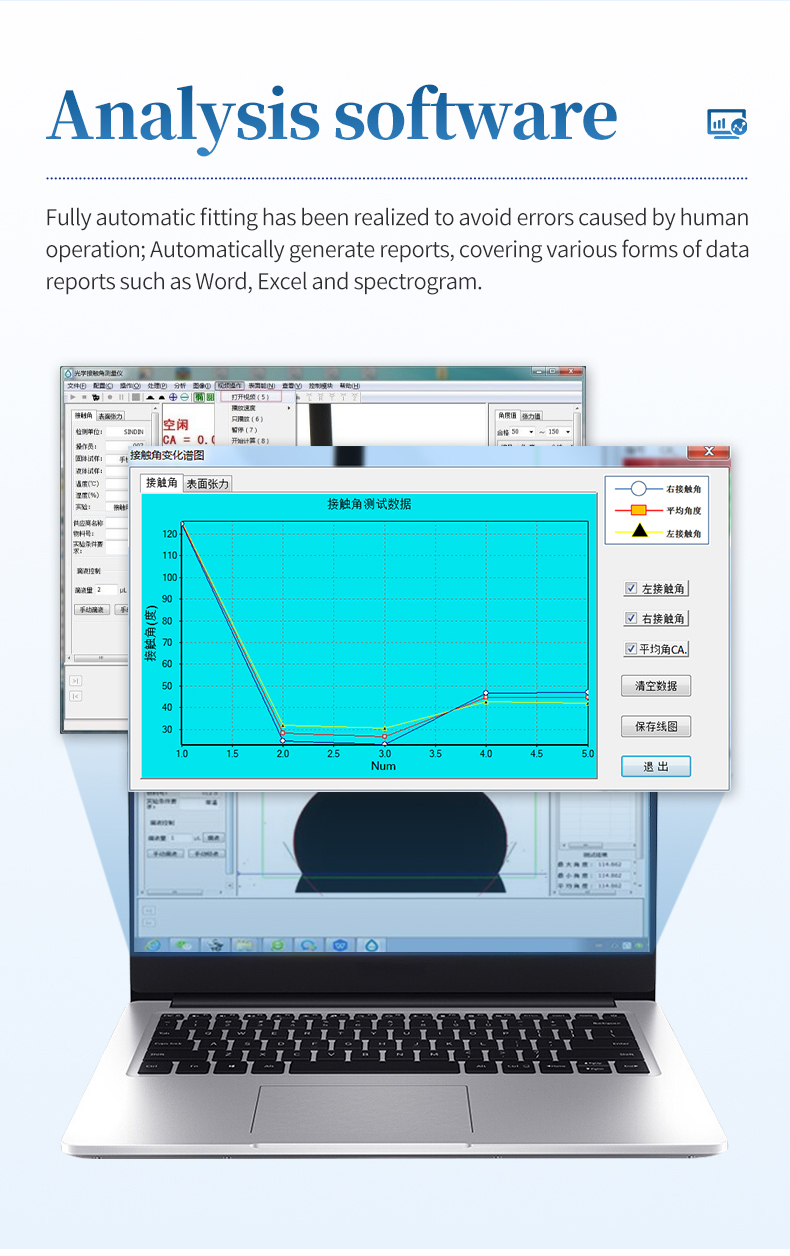 6. The analysis software has powerful functions: it has a one click fully automatic fitting ability and the most advanced fitting method internationally, meeting the precise fitting of various droplet shapes;