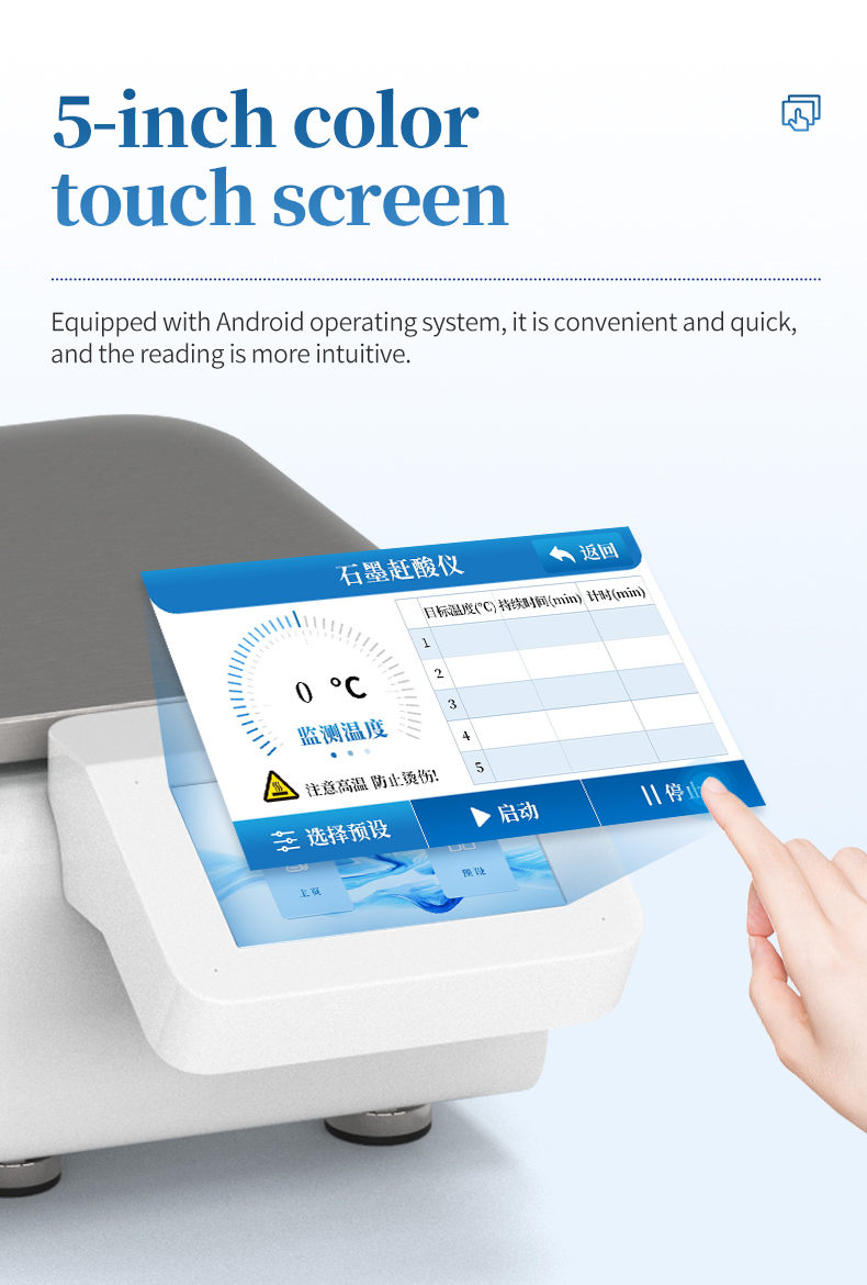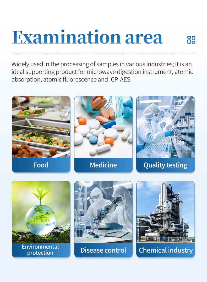 The graphite acid analyzer has the advantages of speed, efficiency, and convenience, and is suitable for sample processing in industries such as food, pharmaceuticals, quality inspection, environmental protection, disease control, chemical engineering, and universities. It can be used for pre-treatment and acid removal in microwave digestion, and is an ideal supporting product for analytical instruments such as atomic absorption, atomic fluorescence, ICP-AES, etc. It is more suitable for use with microwave digestion instruments.
