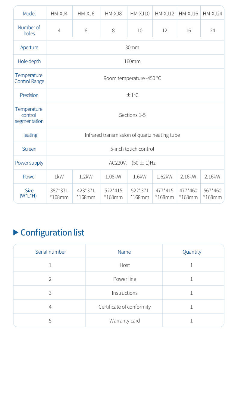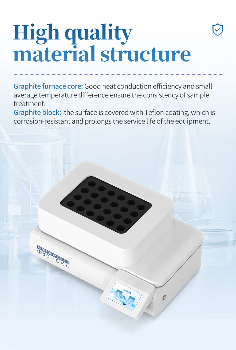 Using high-quality graphite furnace cores, the average temperature difference is small, the sample effect is consistent, and the thermal conductivity efficiency is higher. Graphite blocks are coated with Teflon, which is corrosion-resistant and extends their service life.