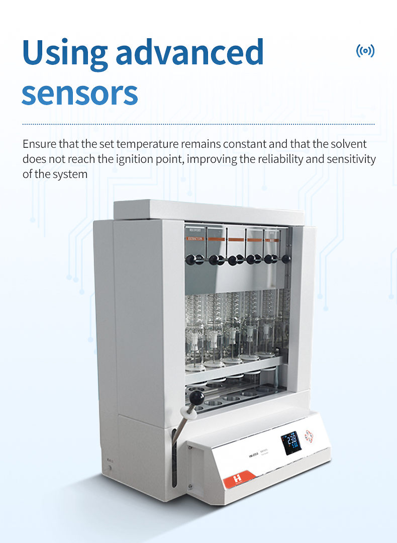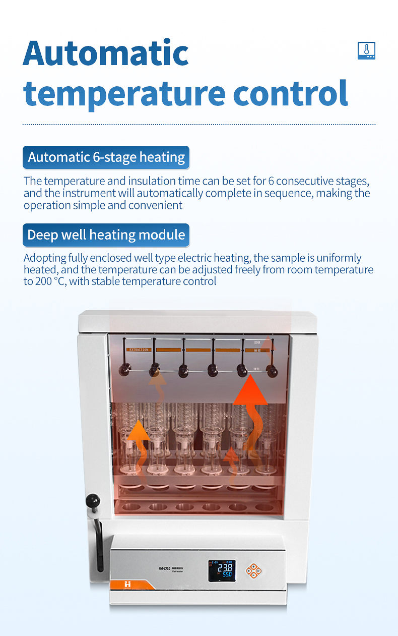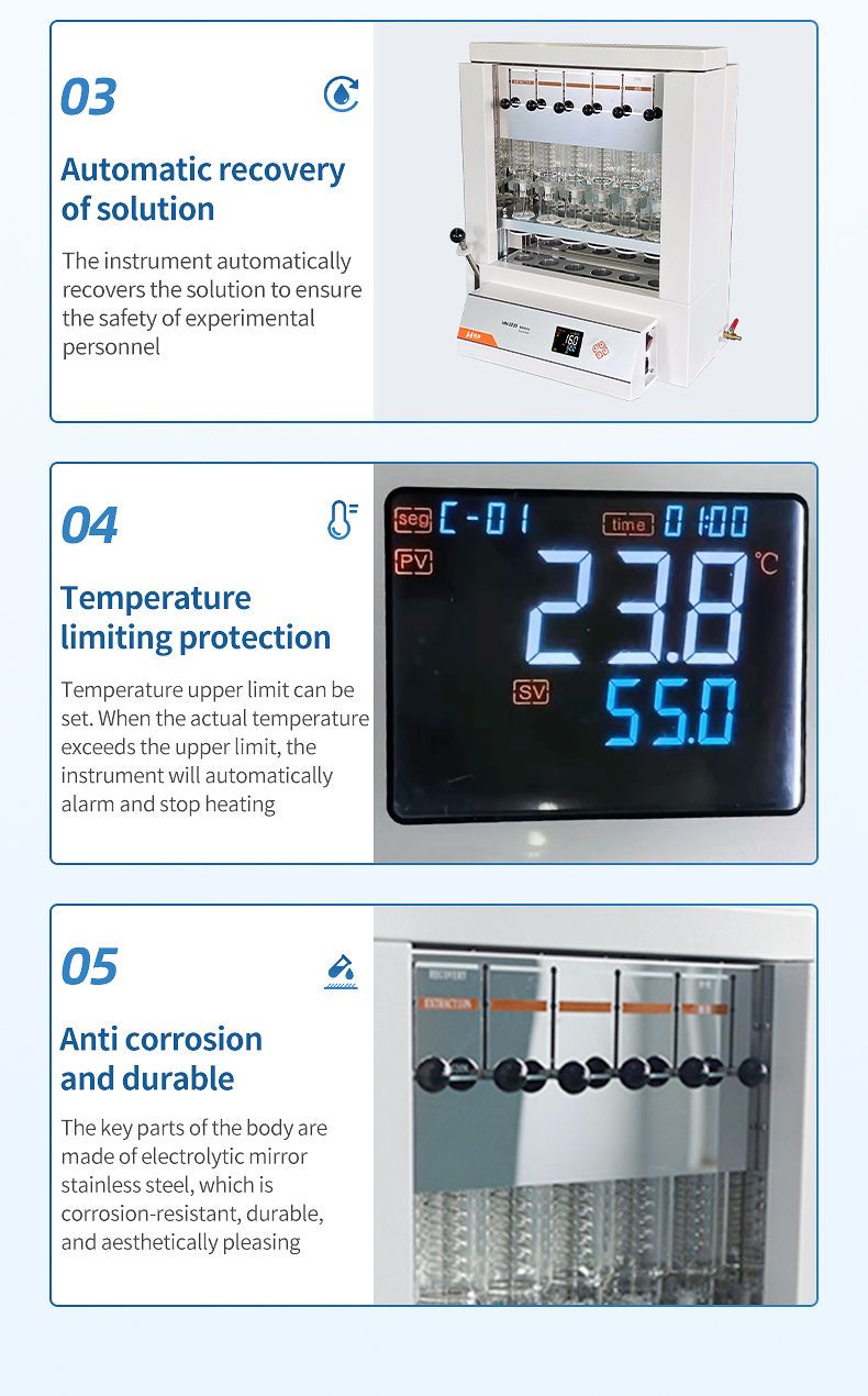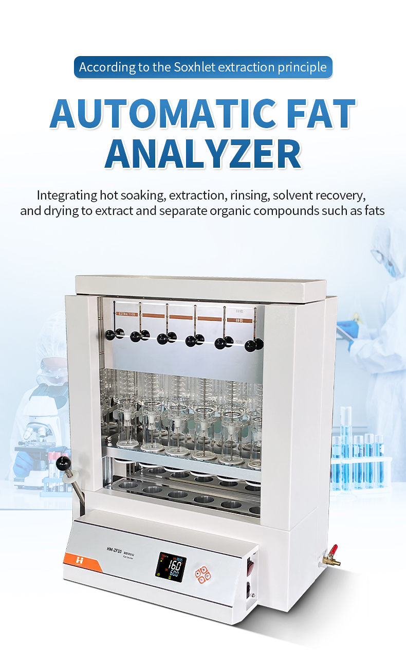 The automatic fat analyzer (Soxhlet extractor) is an instrument that combines heat soaking, extraction, rinsing, solvent recovery, and drying based on the Soxhlet extraction principle to extract and separate organic compounds such as fats. The instrument adopts automatic temperature control and fully enclosed well type electric heating form, which makes the heating of the instrument more uniform, safe and reliable, and has good sealing facilities, thus achieving the purpose of fast and accurate heating; Minimize solvent usage, automatically recover solvents, and save analysis costs. It has the advantages of reasonable design, simple operation, high accuracy, stable performance, good reproducibility, labor-saving, and time-saving.