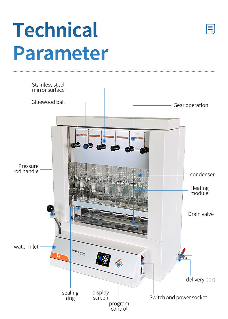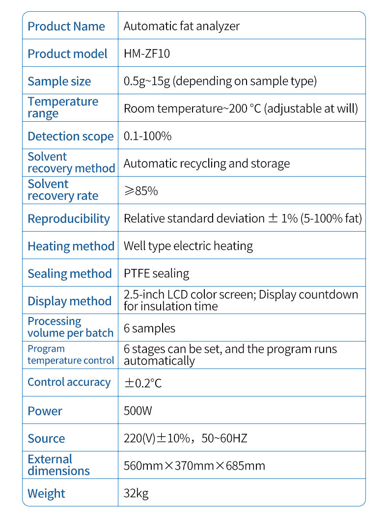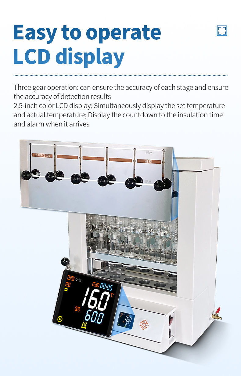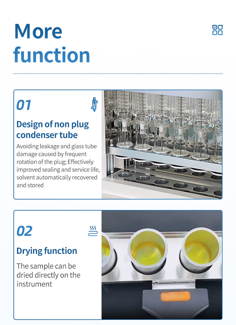 The automatic fat analyzer (Soxhlet extractor) is an instrument that combines heat soaking, extraction, rinsing, solvent recovery, and drying based on the Soxhlet extraction principle to extract and separate organic compounds such as fats. The instrument adopts automatic temperature control and fully enclosed well type electric heating form, which makes the heating of the instrument more uniform, safe and reliable, and has good sealing facilities, thus achieving the purpose of fast and accurate heating; Minimize solvent usage, automatically recover solvents, and save analysis costs. It has the advantages of reasonable design, simple operation, high accuracy, stable performance, good reproducibility, labor-saving, and time-saving.